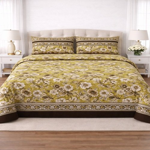 Yellow Printed Bed Sheet With 2 Pillow Covers
